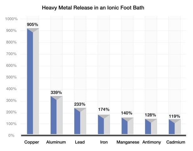 Another study in 2002, conducted by Doctor’s Data (a lab that measures heavy metals) in St. Charles, Illinois, examined the water in the foot basins used for ionic foot bath detox.